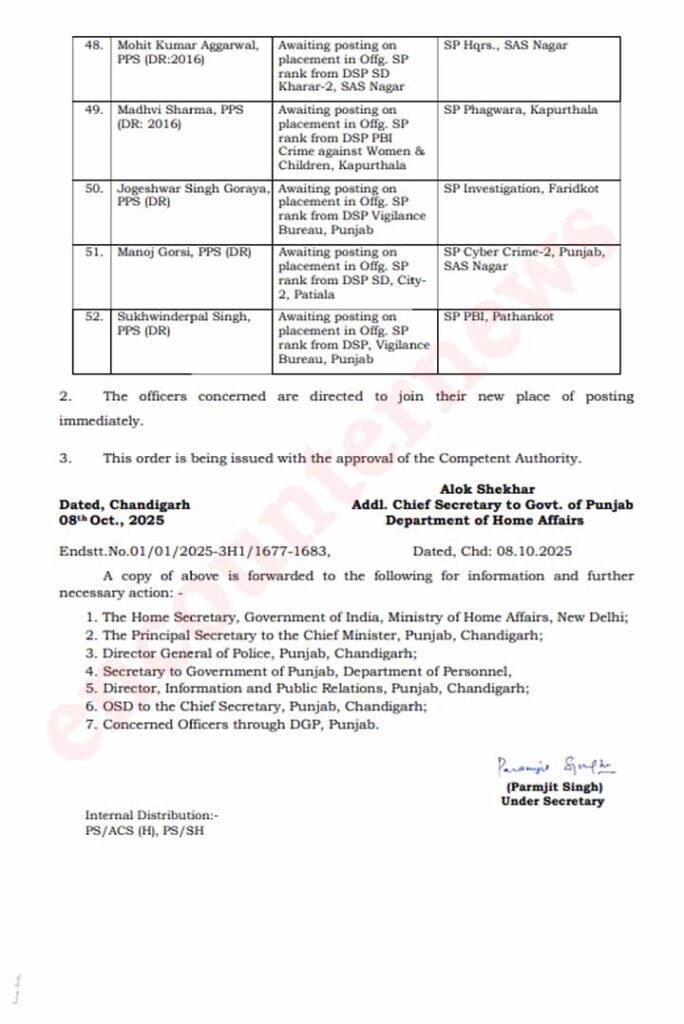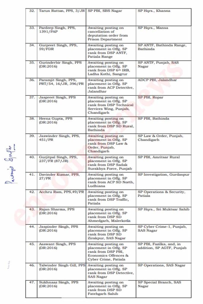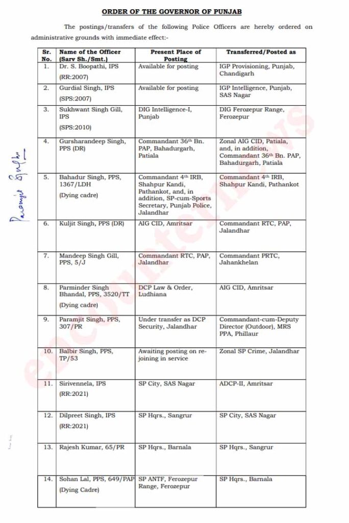 चंडीगढ़: राज्य सरकार द्वारा पंजाब पुलिस मे DSP स्तर पर बड़े तबादले किये गए। जिसके बाद अब SP रैंक के अफसरों के तबादलों के आदेश जारी हुए है। जिनमे 4 IPS और 51 PPS अधिकारियो के नाम शामिल है। निचे दी गई सूचि मे आर्डर की कॉपी मौजूद है।