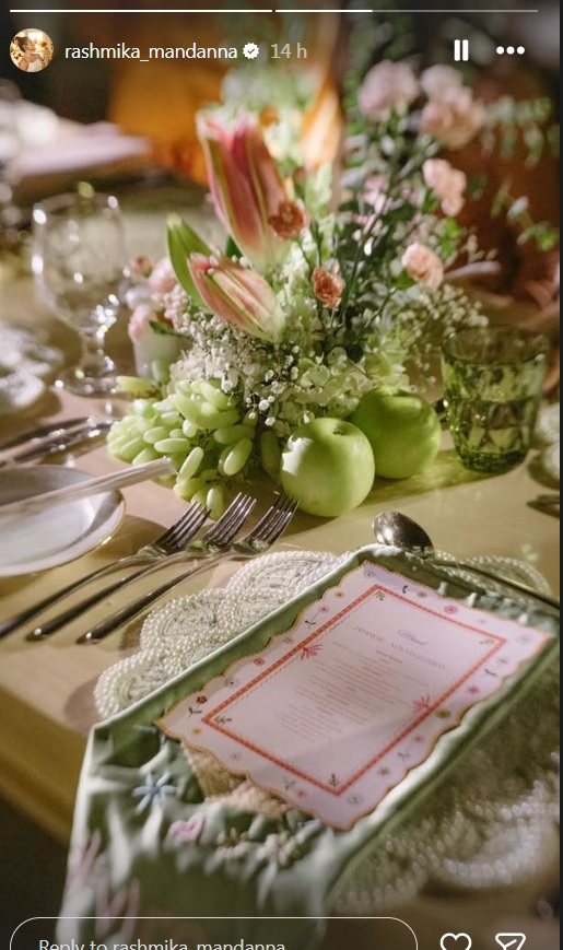 विजय देवरकोंडा के अलावा रश्मिका ने भी वेडिंग वेन्यू के अंदर के डेकोर की तस्वीर फैंस के साथ शेयर की है। इसमें एक खूबसूरती से सजा हुआ टेबलस्कैप दिखाया गया था। बीच में पिंक तिली और हल्के हरे हाइड्रेजिया वाले फूलों की सजावट देखी जा सकती है। इसके साथ ही ताजे हर सेब और गिरते अंगूरों के साथ खूबसूरती से जोड़ा गया था इससे डेकोर को एक ऑर्गेनिक लग्जरी लुक देखने को मिला है। वही टेबल पर खूबसूरती से एक खास प्रिंटेड मेन्यू कार्ड रखा गया था जो मेहमानों के लिए खास तौर पर तैयार किए गए जापानी डाइनिंग एक्सपीरियंस का इशारा दे रहा था।