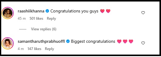 एक्ट्रेस राशि खन्ना ने कमेंट करते हुए लिखा कि – ‘आप दोनों को बहुत बधाई हो’।