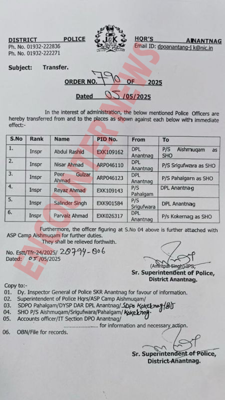 उल्लेखनीय है कि 22 अप्रैल को बैसरन पहलगाम में आतंकियों ने 25 पर्यटकों व एक स्थानीय समेत 26 लोगों की हत्या की है। इस नरसंहार के बाद संबधित थाना प्रभारी पर भी ड्यूटी में लापरवाही बरतने का आरोप लगा था। सिर्फ यही नहीं जांच के दौरान पता चला कि आतंकियों ने हमले से पहले पहलगाम में कुछ अन्य जगहों की रेकी भी की थी, लेकिन संबधित थाना प्रभारी इस विषय में कार्रवाई करने में विफल रहे हैं।