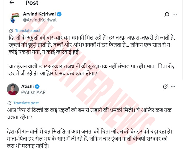 दिल्ली के लगातार स्कूलों को मिल रही धमकियों पर पूर्व सीएम अरविंद केजरीवाल ने सरकार पर निशाना साधा है। उन्होंने एक्स पर लिखा,”दिल्ली के स्कूलों को बार-बार बम धमकी मिल रही हैं। हर तरफ़ अफ़रा-तफ़री हो जाती है, स्कूलों की छुट्टी होती है, बच्चों और अभिभावकों में डर फैलता है… लेकिन एक साल से न कोई पकड़ा गया, न कोई कार्रवाई हुई। 4 इंजन वाली BJP सरकार राजधानी की सुरक्षा तक नहीं संभाल पा रही। माता-पिता रोज़ डर में जी रहे हैं. आख़िर ये सब कब खत्म होगा?