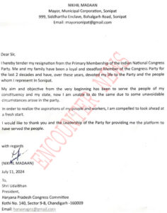 सोनीपतः नगर निगम के पहले मेयर निखिल मदान ने कांग्रेस की प्राथमिक सदस्यता और दायित्व को छोड़ते हुए कांग्रेस के प्रदेशाध्यक्ष उदयभान को अपना इस्तीफा भेज दिया है। आज ही वह दिल्ली के हरियाणा भवन में आयोजित एक कार्यक्रम में मुख्यमंत्री नायब सिंह सैनी, केंद्रीय ऊर्जा मंत्री मनोहर लाल व नव नियुक्त प्रदेशाध्यक्ष मोहन लाल बड़ौली विधिवत रूप से पार्टी की सदस्यता ग्रहण करेंगे। कांग्रेस के युवा नेता निखिल मदान ने वर्ष 2020 में राजनीति में कदम रखने के बाद नगर निगम के मेयर का चुनाव जीता और सोनीपत के पहले मेयर बने थे।