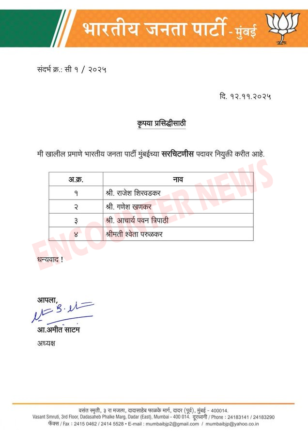 मुबंईः महाराष्ट्र में जनवरी में बृहन्मुंबई नगर निगम (BMC) चुनाव होने से पहले भाजपा में संगठनात्मक फेरबदल देखने को मिला हैं। बीजेपी ने अपनी मुंबई इकाई में 4 नए महासचिव नियुक्त किए हैं। बीजेपी ने राजेश शिरवाडकर, गणेश खापरकर, आचार्य पवन त्रिपाठी और श्वेता पारुलेकर को मुंबई भाजपा के महासचिव के रूप में नई जिम्मेदारियां सौंपी गई हैं। दरअसल, चुनाव को लेकर राजनीतिक पार्टियों ने तैयारियां शुरू कर दी हैं। इसी के चलते बीजेपी ने चुनाव से पहले एक महत्वपूर्ण संगठनात्मक फेरबदल किया है।