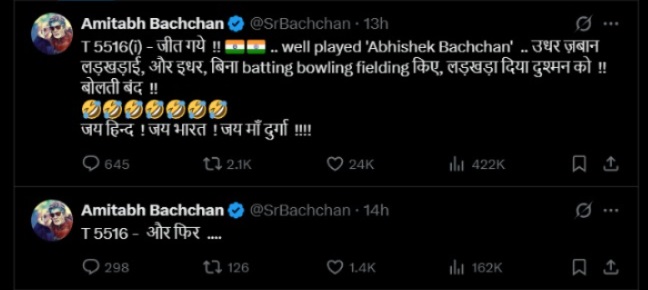 अमिताभ बच्चन ने भी एक msg पोस्ट किया जिसमें टीम के प्रदर्शन और शोएब अख्तर की एक पिछली टिप्पणी, दोनों का ज़िक्र था। उन्होंने लिखा – ‘हम जीत गए! शाबाश ‘अभिषेक बच्चन’। उनकी ज़बान फिसल गई और बिना बैटिंग, बॉलिंग या फ़ील्डिंग के आपने दुश्मन को हरा दिया। जय हिंद! जय भारत! जय माँ दुर्गा!’