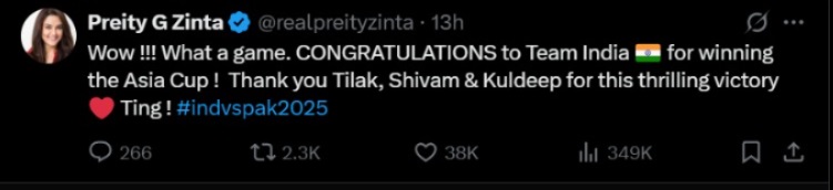 बॉलीवुड की क्वीन और पंजाब किंग्स की co-owner प्रीति ज़िंटा ने ट्वीट कर टीम इंडिया को बधाई दी और लिखा – ‘वाह क्या गेम था, बधाई हो टीम इंडिया एशिया कप जितने के लिए। इसके साथ ही उन्होंने ने तिलक, शिवम और कुलदीप को स्पेशल थैंक्स लिखा’।
