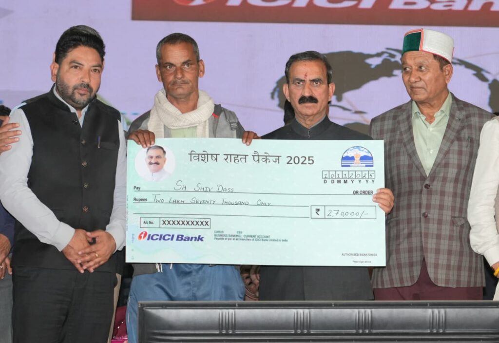 कार्यक्रम के दौरान मुख्यमंत्री ने सराज विधानसभा क्षेत्र के पंगलूर में बाढ़ में अपने माता-पिता को खोने वाली एक बच्ची निकिता को 7.95 लाख रुपये का चेक प्रदान किया। मुख्यमंत्री ने निकिता के लिए 21 लाख रुपये की अतिरिक्त वित्तीय सहायता की भी घोषणा की। उन्होंने कहा कि निकिता जैसी बेटियां अकेली नहीं हैं और प्रदेश सरकार इन बच्चियों के साथ खड़ी है।