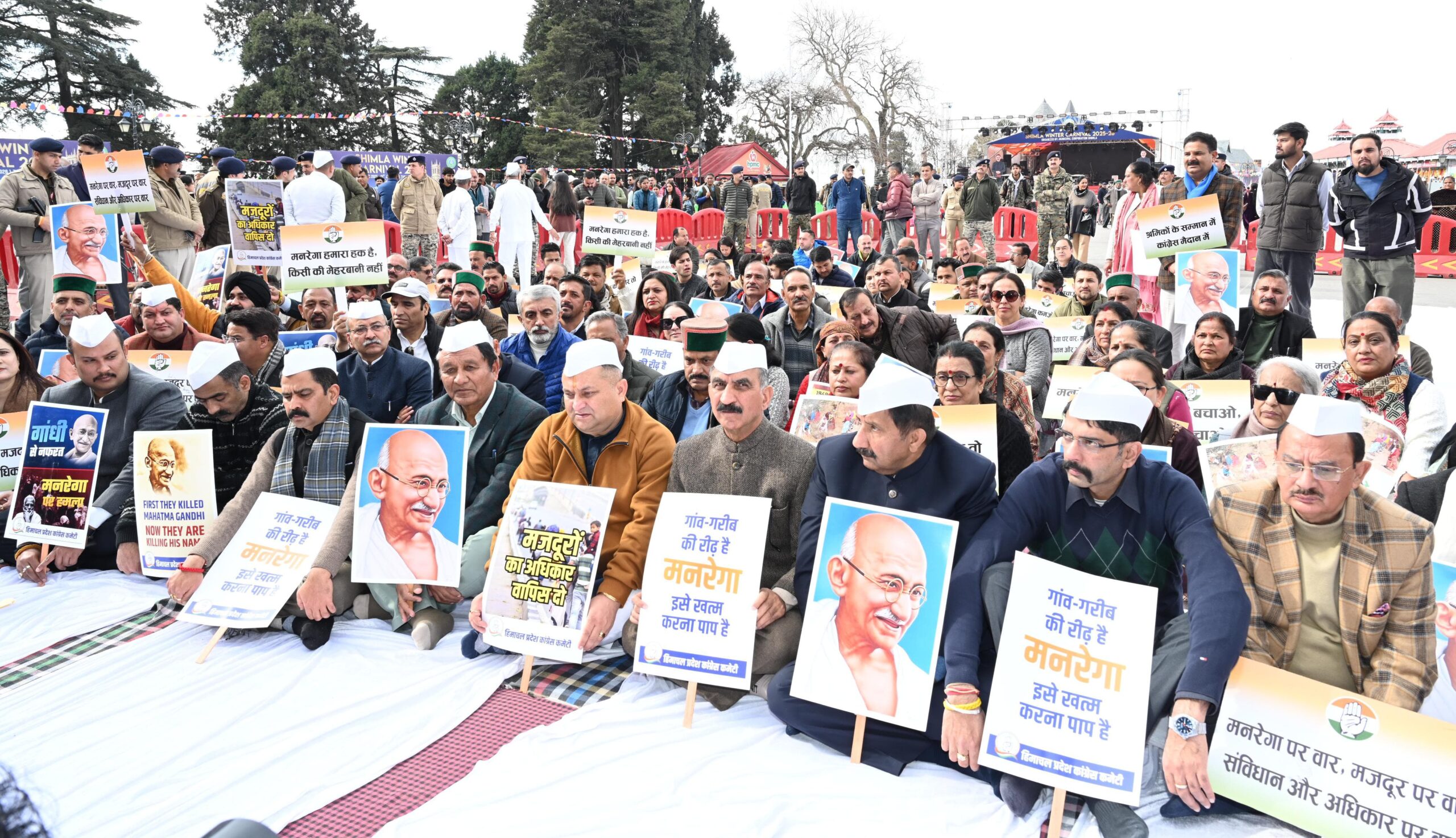 शिमला: मुख्यमंत्री ठाकुर सुखविन्द्र सिंह सुक्खू ने आज रिज मैदान शिमला में महात्मा गांधी की प्रतिमा के पास केन्द्र सरकार द्वारा मनरेगा को समाप्त करने के विरोध में अपने मंत्रिमंडल के सहयोगियों के साथ धरना दिया। इस अवसर पर मुख्यमंत्री ने कहा कि केन्द्र सरकार ने मनरेगा को समाप्त कर ग्रामीण क्षेत्र के गरीबों के साथ कुठाराघात किया है।