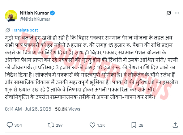 नीतीश कुमार ने एक्स पर एक पोस्ट में लिखा, “मुझे यह बताते हुए खुशी हो रही है कि बिहार पत्रकार सम्मान पेंशन योजना के तहत अब सभी पात्र पत्रकारों को हर महीने 6 हजार रुपये की जगह 15 हजार रुपये पेंशन की राशि प्रदान करने का विभाग को निर्देश दिया है। साथ ही बिहार पत्रकार सम्मान पेंशन योजना के अंतर्गत पेंशन प्राप्त कर रहे पत्रकारों की मृत्यु होने की स्थिति में उनके आश्रित पति/ पत्नी को जीवनपर्यन्त प्रतिमाह 3 हजार रुपये की जगह 10 हजार रुपये की पेंशन राशि दिए जाने का निर्देश दिया है। नीतीश कुमार ने अपनी पोस्ट में आगे कहा, “लोकतंत्र में पत्रकारों की महत्वपूर्ण भूमिका है। वे लोकतंत्र के चौथे स्तंभ हैं और सामाजिक विकास में उनकी महत्वपूर्ण भूमिका है।