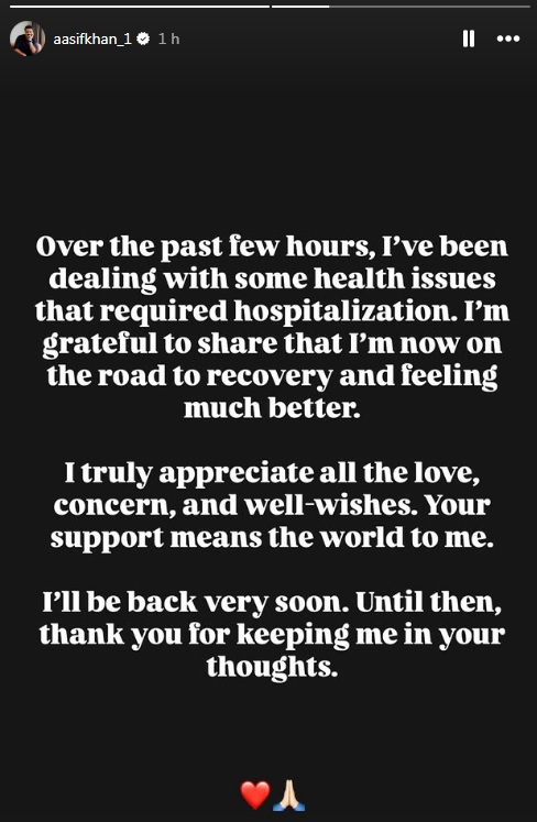 एक और स्टोरी शेयर करते हुए आसिफ ने लिखा कि – ‘पिछले कुछ सालों से मुझे कुछ हेल्थ इश्यूज हो रहे हैं जिसके कारण मुझे अस्तपाल जाने की जरुरत पड़ी। मैं आपको बताते हुए अच्छा लग रहा है कि अब मैं रिकवर हो रहा हूं और अच्छा महसूस हो रहा हूं। मैं आप सबसे प्यार और दुआओं का शुक्रिया अदा करता हूं। मैं जल्द वापिस आऊंगा। मुझे अपनी दुआओं में याद रखने के लिए धन्यवाद’।