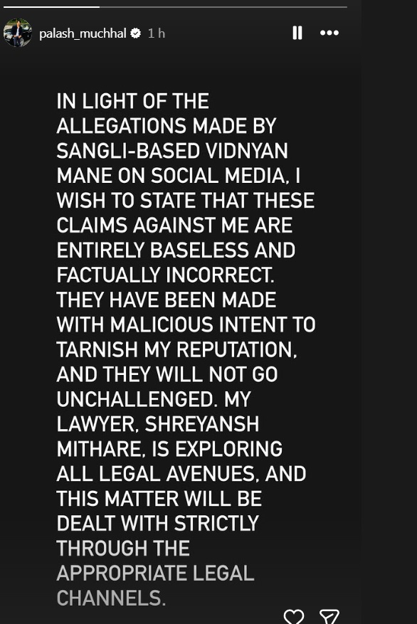पलाश ने अपने साथ हुई धोखाधड़ी पर चुप्पी तोड़ी है। उन्होंने सोशल मीडिया पर लिखा कि – ‘मेरे खिलाफ खबरें चल रही हैं। सांगली के रहने वाले विद्दान माने ने मुझ पर आरोप लगाए हैं कि सभी आरोप झूठे हैं। मुझे लेकर जो भी कहा जा रहा है उन खबरों में किसी भी तरह की सच्चाई नहीं है। ये सारी चीजें मेरी इज्जत की धज्जियां उड़ाने के लिए की जा रही हैं और मैं इन लोगों को नहीं छोडू़ंगा मेरे वकील ने इस मुद्दे पर एक्शन लेना शुरु कर दिया है। इस मुद्दे को लीगली गंभीरता के साथ हैंडल किया जाएगा’।
