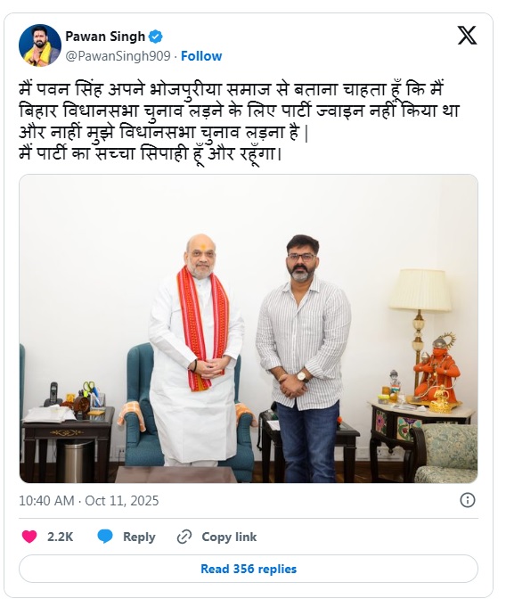 सोशल मीडिया पर लिखा कि मैं पवन सिंह अपने भोजपुरीया समाज से बताना चाहता हूं कि मैं बिहार विधानसभा चुनाव लड़ने के लिए पार्टी ज्वाइन नहीं किया था और ना हीं मुझे विधानसभा चुनाव लड़ना है। मैं पार्टी का सच्चा सिपाही हूं और रहूंगा।