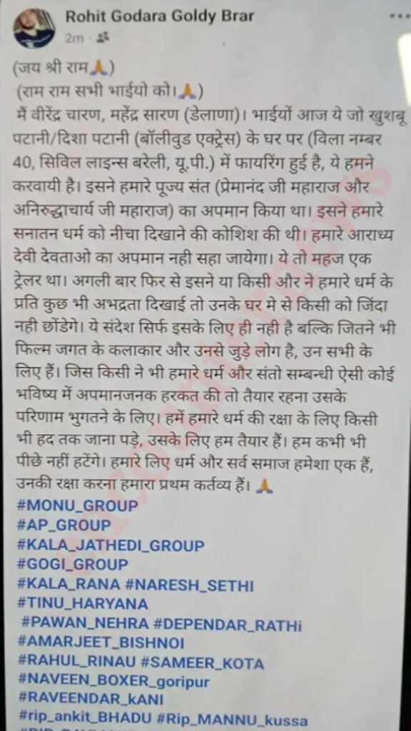 रोहित गोदारा गोल्डी बरार की वायरल पोस्ट की शुरुआत में लिखा है जय श्री राम, आज दिशा पाटनी और खुशबू पाटनी के घर जो की सिविल लाइन्स बरेली में है और उनके घर का नंबर 40 है, वहां जो फायरिंग हुई है वो हमने करवाई है। आगे पोस्ट है कि ऐसा करने की वजह ये थी कि उन्होंने संत प्रेमानंद जी महाराज का अपमान किया था। सनातन धर्म को नीचा दिखाया और हमारे देवी देवताओं का अपमान किया तो यह सब नहीं सहा जाएगा। उन्होंने ये भी लिखा कि ये तो सिर्फ एक ट्रेलर था। अगली बार अगर धर्म का अपमान किया तो किसी को भी जिन्दा नहीं छोड़ेंगे। पोस्ट के अंत में लिखा कि वो धर्म की रक्षा के लिए किसी भी हद तक जा सकते हैं और कभी पीछे नहीं हटेंगे।