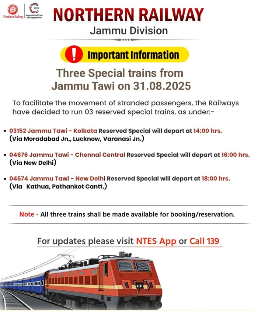 एक आधिकारिक प्रवक्ता के अनुसार उत्तर रेलवे 31 अगस्त को जम्मू स्टेशन से यात्रियों के लिए 3 विशेष ट्रेनें चलाएगा। ये ट्रेनें हैं 04674 (जम्मू-नई दिल्ली वाया कठुआ, पठानकोट कैंट, जम्मू तवी प्रस्थान 18:00 बजे), 04676 (जम्मू-एमएएस चेन्नई वाया नई दिल्ली, जम्मू तवी प्रस्थान 16:00 बजे) और 03152 (जम्मू-कोलकाता वाया मुरादाबाद, लखनऊ, बनारस, जम्मू तवी प्रस्थान 14:00 बजे)।