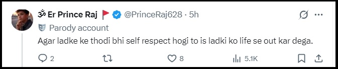 अन्य ने कहा कि – ‘अगर लड़के को थोड़ी सेल्फ रिस्पेक्ट होगी तो इस लड़की को जिंदगी से निकाल देगा’।