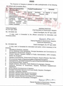 चंडीगढ़ः हरियाणा सरकार ने आज 2 आईएएस अधिकारियों के तबादलें किए है। जारी आदेशों के अनुसार दोनों अधिकारियों के तबादलें तुरंत प्रभाव से लागू होंगे। मुख्य सचिव अनुराग रस्तोगी द्वारा जारी आदेशों के अनुसार महेंद्रगढ़ (नारनौल) के उपायुक्त मनोज कुमार-I को वित्त विभाग में विशेष सचिव नियुक्त किया गया है। इसी प्रकार, हरियाणा शहरी विकास प्राधिकरण (एचएसवीपी), फरीदाबाद की प्रशासक तथा शहरी संपदा, फरीदाबाद की अतिरिक्त निदेशक सुश्री अनुपमा अंजलि को महेंद्रगढ़ (नारनौल) का उपायुक्त लगाया गया है। देखें लिस्ट