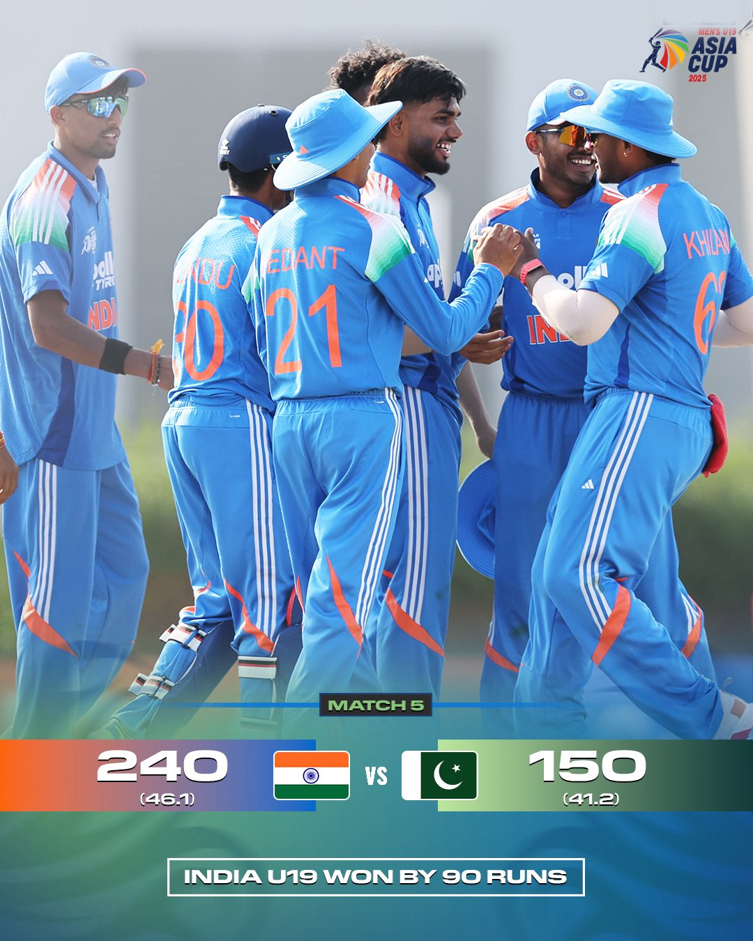 भारत ने पाकिस्तान को 90 रन से हराकर लगातार दूसरी जीत अपने नाम की। टीम इंडिया की गेंदबाजी और बल्लेबाजी दोनों ही शानदार रही। इस जीत के साथ भारत अंडर-19 एशिया कप में अपनी स्थिति मजबूत करता दिख रहा है।