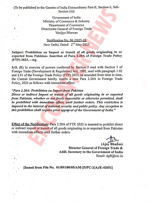 चंडीगढ़ः पहलगाम में हुए आतंकी हमले के बाद भारत सरकार द्वारा लगातार पाकिस्तान के खिलाफ सख्त एक्शन लिए जा रहे है। वहीं भारत ने पाकिस्तान से आने वाले सभी सामानों के आयात (इंपोर्ट) पर रोक लगा दी है। सरकार ने शनिवार को नोटिफिकेशन जारी किया है। इसमें कहा गया कि इस बैन से किसी को छूट चाहिए तो सरकार से परमिशन लेनी होगी। अब पाकिस्तान से सीधे या किसी और रास्ते से कोई भी चीज भारत में नहीं लाई जा सकेगी। यह फैसला देश की सुरक्षा और जनता के हित में लिया गया है।