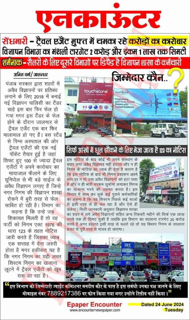 जालंधर (ENS): पंजाब सरकार द्वारा शहरों में अवैध विज्ञापनों पर प्रतिबंध लगाने के लिए 2018 में बनाई गई विज्ञापन पालिसी का टैंडर चाहे इस बार फिर फेल हो गया मगर इस टैंडर के फेल होने के दौरान जालन्धर के ट्रैवल एजैंट एक बार फिर मालामाल हो गए हैं।