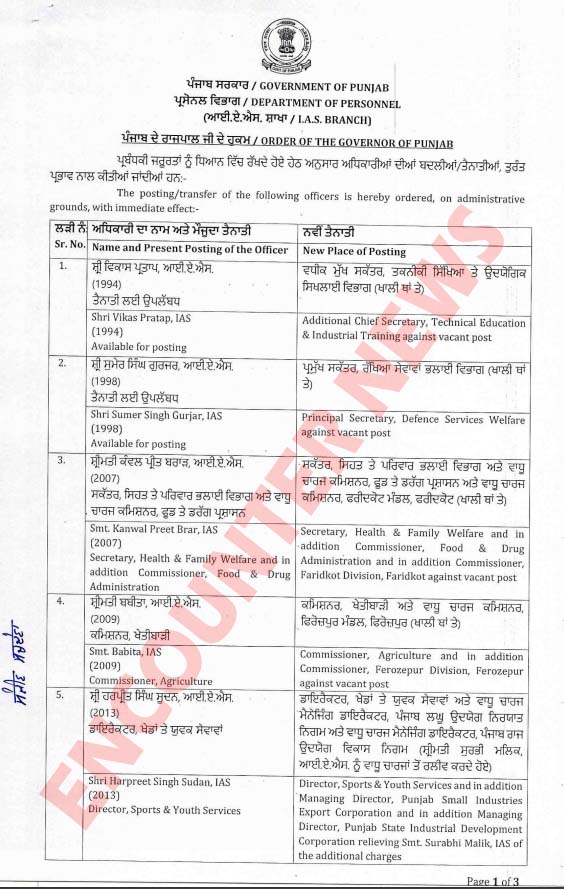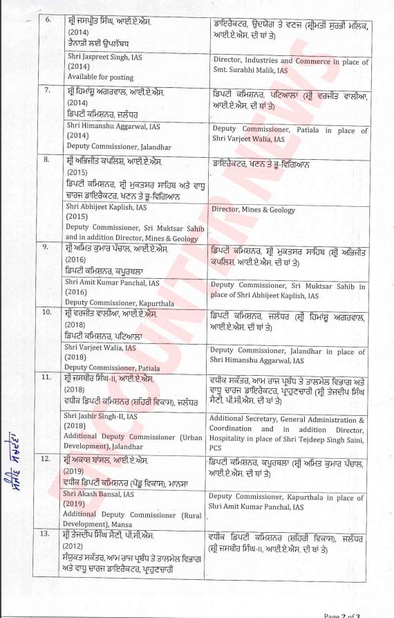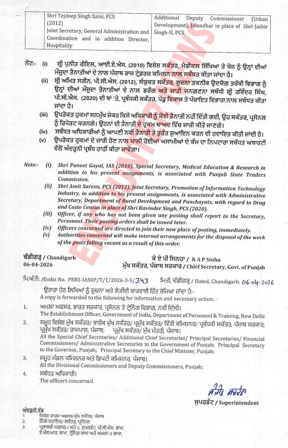 हरप्रीत सिंह सूदन अब खेल निदेशक के साथ-साथ PSIEC के प्रबंध निदेशक का कार्यभार संभालेंगे, जबकि जसबीर सिंह-II को सामान्य प्रशासन में अतिरिक्त सचिव और तेजदीप सिंह सैनी को जालंधर का एडिशनल डिप्टी कमिश्नर (शहरी विकास) नियुक्त किया गया है। आदेश के अनुसार पुनीत गोयल को ट्रेडर्स कमीशन का अतिरिक्त प्रभार दिया गया है। देखें लिस्ट