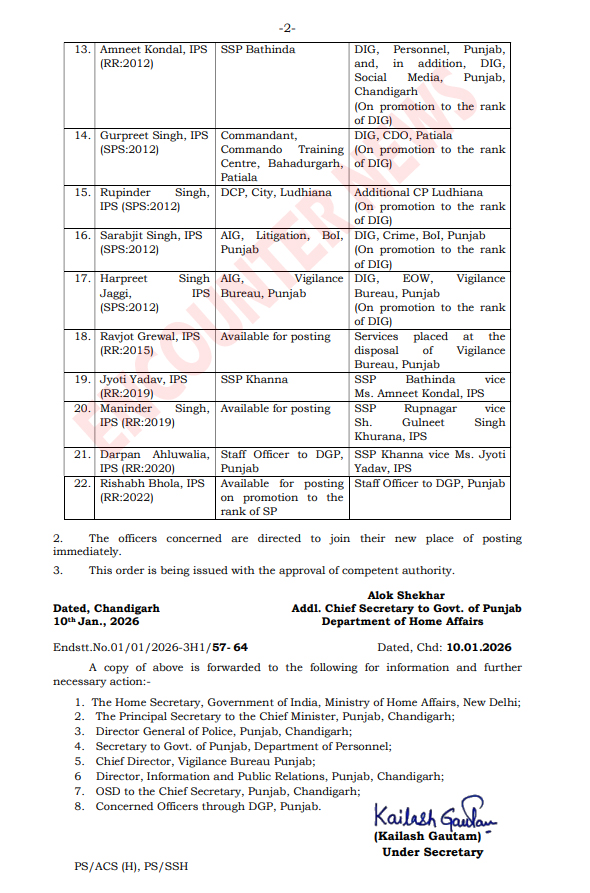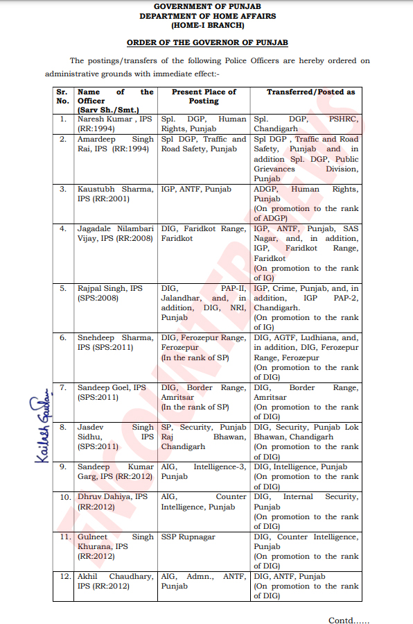 मोहालीः पंजाब में पुलिस अधिकारियों के लगातार तबादलें हो रहे है। वहीं जारी आदेशों के अनुसार आज 22 आईपीएस अधिकारियों के तबादलें किए गए है। वहीं जालंधर पीएपी-2 में तैनात डीआईजी राजपाल सिंह को आईजीपी चंडीगढ़ पीएपी में तैनात किया गया है। देखें लिस्ट