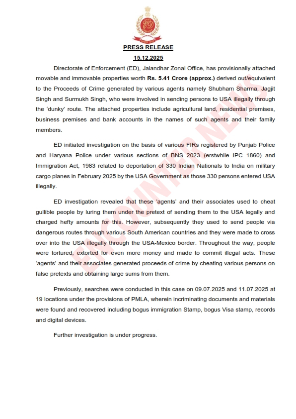 जालंधर, ENS: डंकी रूट के माध्यम से चल रहे एक बड़े गैर-कानूनी इमिग्रेशन और मानव तस्करी रैकेट के संबंध में जालंधर ईडी ने 3 एजेंटों के खिलाफ एक्शन लिया है। इसी को लेकर इनफोर्समेंट डायरेक्टोरेट (ईडी) जालंधर जोन ने डंकी रूट से अमेरिका जाने वाले गैर-कानूनी इमिग्रेशन और मानव तस्करी रैकेट के संबंध में 3 एजेंटों से संबंधित 5.41 करोड़ रुपये की चल और अचल संपत्ति को अस्थायी रूप से जब्त कर लिया है। जब्त की गई संपत्तियों में कृषि भूमि, आवासीय और व्यावसायिक इमारतें तथा आरोपी एजेंटों और उनके परिवार के सदस्यों के नाम पर बैंक खाते शामिल हैं। यह जानकारी एक वरिष्ठ अधिकारी ने दी।