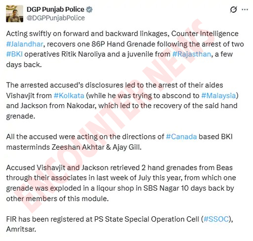 ਪੰਜਾਬੀ ਵਿੱਚ ਪੜ੍ਹੋ :- ਪੰਜਾਬ ਪੁਲਿਸ ਨੇ ਵੱਡੀ ਅੱਤਵਾਦੀ ਘਟਨਾ ਨੂੰ ਟਾਲਿਆ, ਗ੍ਰਿਫ਼ਤਾਰ ਕੀਤੇ ਗਏ ਕਾਰਕੁੰਨਾਂ ਤੋਂ ਹੈਂਡ ਗ੍ਰਨੇਡ ਬਰਾਮਦ