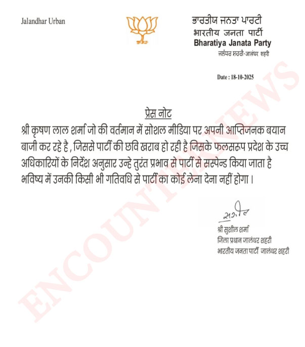 जालंधर, ENS: शहरी इकाई ने अपने नेता कृष्ण लाल शर्मा को पार्टी से सस्पेंड कर दिया है। पार्टी के प्रेस नोट में कहा गया है कि श्री शर्मा हाल ही में सोशल मीडिया पर ऐसे बयान दे रहे थे, जो पार्टी की छवि को नुकसान पहुंचा रहे थे।