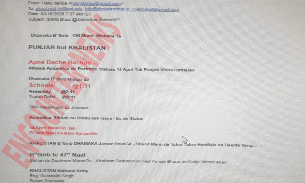 जालंधर, ENS: महानगर में एक बार स्कूलों को धमकी भरा ई-मेल आया है। जिसमें एपीजे और डीपीएस सहित अन्य स्कूल को धमकी दी गई है। इसी के साथ सीएम मान को भी धमकी दी गई है। ई-मेल में 1.11 बजे स्कूलों को बम से उड़ाने की धमकी दी गई है। इसी के साथ असेंबली में 2.11 बजे का जिक्र किया गया है, वहीं दिल्ली ट्रेन को 9.11 बजे का जिक्र है। इसी के साथ सीएम भगवंत मान को धमकी दी गई है। मेल को हाबी दानबा के अकाउंट से भेजा गया है। सुबह 7 बजकर 37 मिनट पर भेजी गई मेल के टू में skool.rmd.jln@apj.edu, nfo@dpsjalandhar.in, oedcisjal@gmail.com का जिक्र है।