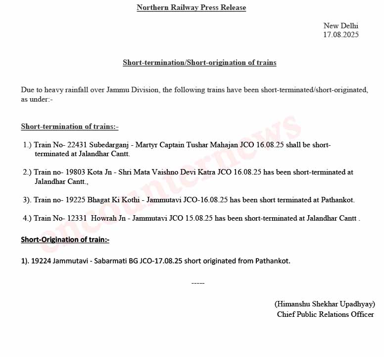 इसी के साथ 19803 कोटा से कटरा जानी वाली भी शॉर्ट टर्मिनेटेड और 12331 हावड़ा से जम्मूतवी को जालंधर कैंट से शॉर्ट टर्मिनेटेड किया गया है। गाड़ी संख्या 19225 भगत की कोठी से जम्मूतवी और 19224 जम्मूतवी से साबरमती को पठानकोट से शॉर्ट टर्मिनेटेड किया गया है। वहीं इन ट्रेनों के शॉट टर्मिनेटेड होने के चलते यात्रियों को परेशानी का सामना करना पड़ सकता है।