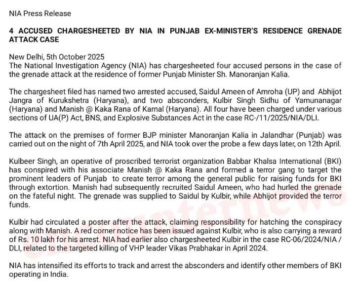 दरअसल, पूर्व भाजपा मंत्री मनोरंजन कालिया के परिसर पर 7 अप्रैल 2025 की रात को हमला हुआ था। जिसके कुछ दिनों बाद, 12 अप्रैल को एनआईए ने जांच अपने हाथों में ले ली। एनआईए की जांच में पाया गया कि प्रतिबंधित आतंकवादी संगठन बब्बर खालसा इंटरनेशनल (बीकेआई) के एक कार्यकर्ता कुलबीर सिंह ने अपने सहयोगी मनीष उर्फ काका राणा के साथ मिलकर पंजाब के प्रमुख नेताओं को निशाना बनाने और आम जनता में आतंक पैदा करने के लिए एक आतंकवादी गिरोह बनाया ताकि वह लोगों से जबरन वसूली के ज़रिए बीकेआई के लिए धन जुटा सके। इस ग्रुप में मनीष ने बाद में सैदुल अमीन को भर्ती किया, जिसने पूर्व मंत्री के घर 7 अप्रैल की रात ग्रेनेड फेंका था।