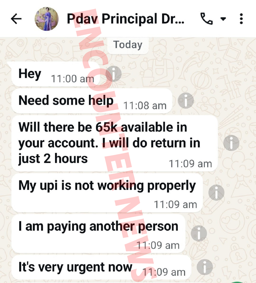 संदेश में आगे लिखा है कि भुगतान करने में दिक्कत आ रही है और यूपीआई ठीक से काम नहीं कर रहा, जिससे सामने वाला व्यक्ति तुरंत सहायता भेज दे। हैकर ने चालाकी से ऐसा संदेश तैयार किया, जिससे लोगों को यह विश्वास हो सके कि यह संदेश वास्तव में प्रिंसिपल द्वारा ही भेजा गया है। घटना सामने आने के बाद स्कूल प्रबंधन और प्रिंसिपल की ओर से अपने परिचितों और अभिभावकों को सतर्क किया गया है कि ऐसे किसी भी संदेश पर भरोसा न करें और कोई भी राशि न भेजें।