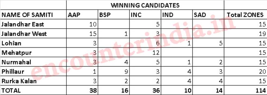 रिजल्ट के अनुसार आप 38, कांग्रेस 36, बीएसपी 16, शिअद 14 और 10 सीटें आजाद उम्मीदवारों को मिली है। वोटों की काउंटिंग के लिए जिले भर में बनाए गए 11 स्ट्रांग रूम में बैलेट पेपरों की काउंटिंग प्रोसेस के बाद यह नतीजे घोषित हुए है। बता दें कि चुनावों की गिनती के लिए आदमपुर के लिए स्कूल ऑफ एमिनेंस, ब्लॉक भोगपुर के लिए सरकारी सीनियर सेकेंडरी स्कूल (लड़कियां) लोहारा चरके रोड भोगपुर, ब्लॉक जालंधर ईस्ट के लिए दोआबा कॉलेज, ब्लॉक जालंधर वेस्ट के लिए लायलपुर खालसा कॉलेज फॉर वूमेन कैंट रोड, ब्लॉक लोहियां खास के लिए सरकारी आईटीआई लोहियां खास, ब्लॉक मेहतपुर और ब्लॉक नकोदर के लिए गुरु नानक नेशनल कॉलेज नकोदर, ब्लॉक नूरमहल के लिए दोआबा आर्य सीनियर सेकेंडरी स्कूल नूरमहल, ब्लॉक फिल्लौर के लिए कम्युनिटी हॉल फिल्लौर, ब्लॉक रुड़की कला के लिए गुरु नानक खालसा कॉलेज संग ढेसियां और ब्लॉक शाहकोट के लिए सरकारी आर्ट्स कॉलेज शाहकोट बनाए गए थे।