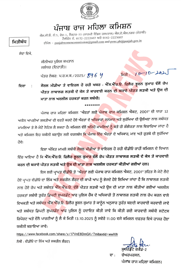 आयोग ऐसे मामलों को बेहद गंभीरता से देखता है और यह सुनिश्चित करने के लिए प्रतिबद्ध है कि पंजाब में महिलाओं के अधिकार, सम्मान और प्रतिष्ठा की रक्षा हो। उन्होंने कहा कि मामला सोशल मीडिया पर वायरल हो रहे वीडियो के माध्यम से आयोग के ध्यान में आया है कि एसएचओ भूषण कुमार द्वारा रेप पीड़ित नाबालिग लड़की के मामले में कार्रवाई करने की बजाय पीड़ित लड़की और उसकी माता के साथ अश्लील हरकतें की गई हैं। अतः प्राप्त वीडियो के आधार पर पंजाब राज्य महिला आयोग अधिनियम, 2001 के तहत स्व-प्रेरित कार्रवाई लेते हुए प्राप्त वीडियो का लिंक और स्क्रीनशॉट की प्रति आपको भेजते हुए लिखा जाता है कि नाबालिग लड़की के साथ हुए रेप और संबंधित एस.एच.ओ. द्वारा पीड़ित लड़की तथा उसकी माता के साथ की गई।
