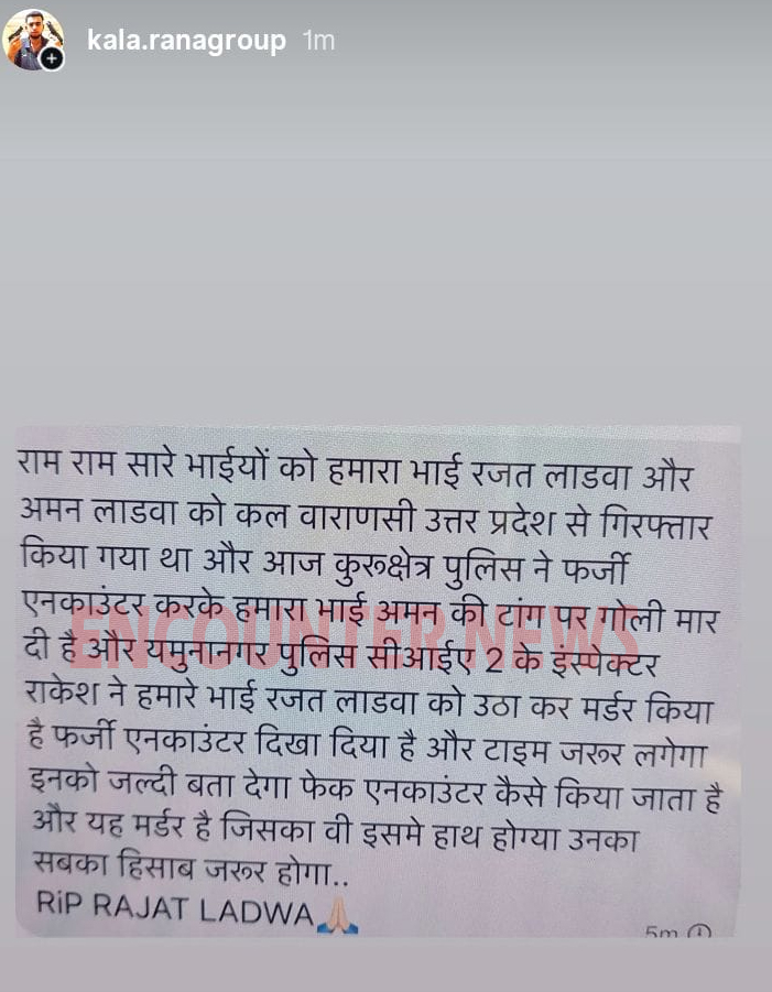 इस मामले में कुरुक्षेत्र पुलिस ने फर्जी एनकाउंटर करके हमारा भाई अमन की टांग पर गोली मार दी है। यमुनानगर पुलिस सीआईए 2 के इंस्पेक्टर राकेश ने हमारा भाई रजत लाडवा को उठा कर मर्डर किया है। फर्जी एनकाउंटर दिखा दिया है। टाइम जरूर लगेगा, इनको जल्दी बता देंगे फेक एनकाउंटर कैसे किया जाता है? इस मर्डर में जिसका भी हाथ होगा उनका सबका हिसाब जरूर होगा।’