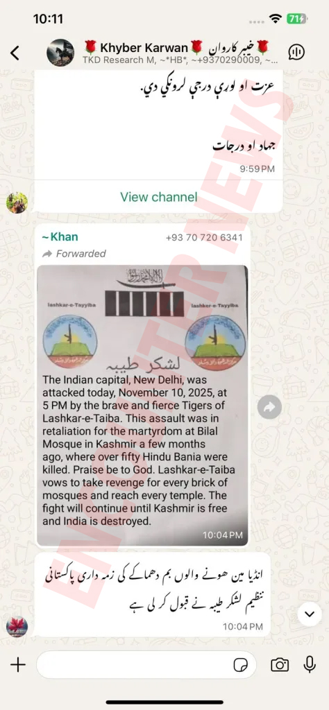 सोशल मीडिया पर एक पोस्ट में पाकिस्तानी संगठन लश्कर-ए-तैयबा ने भारत में हुए बम विस्फोटों की जिम्मेदारी ली है। सोशल मीडिया के टेलीग्राम प्लेटफॉर्म पर लश्कर ए तैयबा के नाम से एक पोस्ट वायरल किया का रहा है जिसमें दिल्ली में हुए ब्लास्ट की जिम्मेदारी लेने का दावा किया गया है। जानकारी के अनुसार पोस्ट में बताया गया है कि ऑपरेशन सिंदूर में पीओके में बिलाल मस्जिद पर इंडियन मिसाइल ने अटैक किया था। यह उसी का बदला बताया गया है। इस वायरल पोस्ट की पुलिस जांच कर रही है। पोस्ट में लिखा है कि भारत की राजधानी नई दिल्ली पर आज, 10 नवंबर 2025, शाम 5 बजे लश्कर-ए-तैयबा के बहादुर और खूंखार टाइगर्स ने हमला किया।