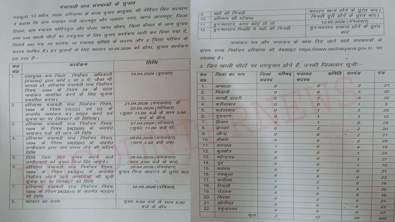 नगर पालिका टोहाना (फतेहबाद) वार्ड 17, झज्जर वॉर्ड, राजौंद वॉर्ड 11, तरावड़ी वार्ड 08, कनीना वार्ड और 14 और सढौरा वॉर्ड 09। चुनाव के दौरान कार्यक्रम कुछ ऐसा लगेगा। 15.04.2026 रिटर्निंग ऑफिसर द्वारा नोटिस जारी, 21.04 से 25.04.2026 नामांकन पत्र दाखिल, सुबह 11 से दोपहर 3 बजे तक 27.04.2026 नामांकन पत्रों की जांच, सुबह 11:30 बजे, 28.04.2026 नाम वापस लेने की अंतिम तिथि, सुबह 11 से दोपहर 3 बजे तक, 28.04.2026 चुनाव चिन्ह आवंटन, दोपहर 3 बजे के बाद , 28.04.2026 चुनाव लड़ने वाले उम्मीदवारों की अंतिम सूची जारी