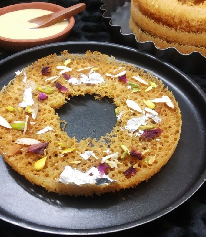 7. अब ठंडा घेवर चाशनी में डुबोएं और निकाल कर ऊपर से ड्राय फ्रूट्स और इलायची पाउडर से सजाएं। चाहें तो ऊपर से मावा या मलाई भी डाल सकते हैं।