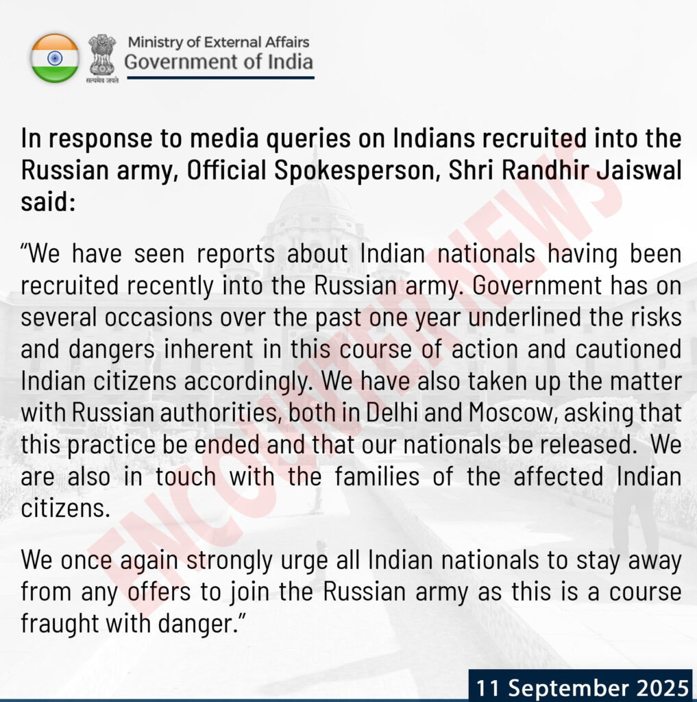 इस मामले को लेकर केंद्र सरकार एक्शन मोड में आ गई है। रूसी सेना में भारतीयों की भर्ती मामले में भारत के विदेश मंत्रालय ने नया बयान जारी किया है। भारत सरकार ने लोगों को सतर्क रहने की सलाह दी है। भारत सरकार ने एक बार फिर भारत के नागरिकों से आग्रह किया है कि वो यूक्रेन जंग के बीच रूसी सेना में शामिल होने के किसी भी ऑफर को स्वीकार नहीं करें क्योंकि यह खतरे से भरा रास्ता है। रूसी सेना में भर्ती भारतीयों पर मीडिया के सवालों के जवाब में, विदेश मंत्रालय के प्रवक्ता रणधीर जयसवाल ने एक बयान जारी करके सरकार का पक्ष रखा है। बयान में विदेश मंत्रालय के आधिकारिक प्रवक्ता के हवाले से कहा गया है कि “हमने हाल ही में रूसी सेना में भारतीय नागरिकों की भर्ती के बारे में रिपोर्टें देखी हैं। सरकार ने पिछले एक साल में कई मौकों पर इससे जुड़े जोखिमों और खतरों को रेखांकित किया है और उसके अनुसार भारतीय नागरिकों को आगाह किया है।