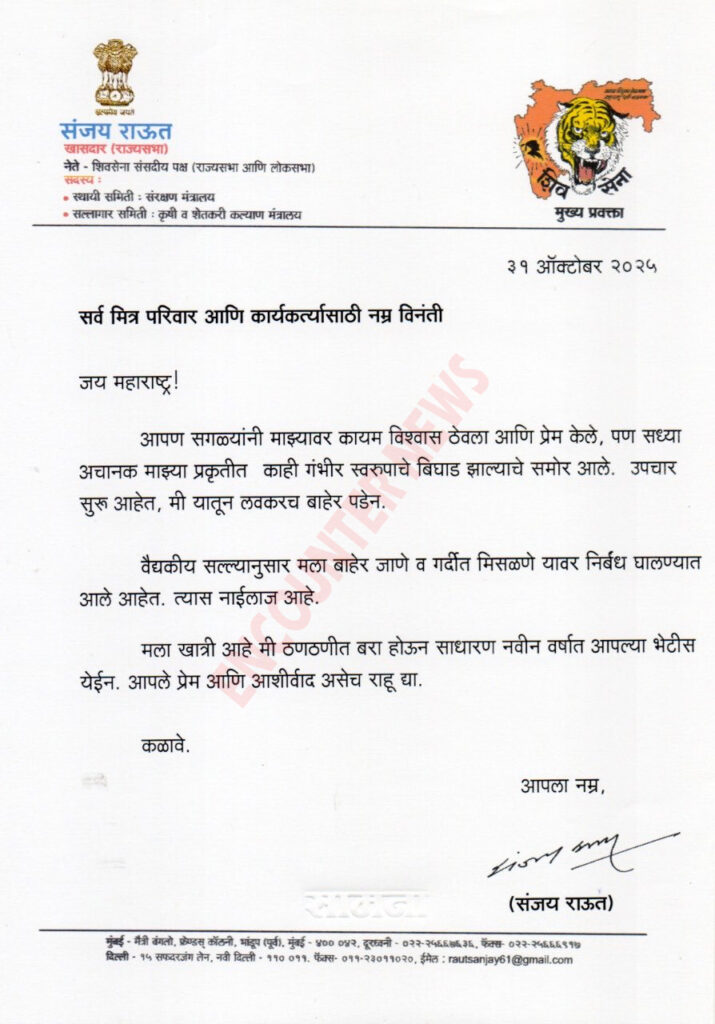 संजय राउत ने सार्वजनिक कार्यक्रमों से उस समय दूरी बनाने का फैसला लिया है, जब एक दिन बाद शनिवार को मुंबई में विपक्षी पार्टियां मतदाता सूची में गड़बड़ी जैसे आरोपों को लेकर मार्च निकालेंगी। शिवसेना-यूबीटी के मुखपत्र ‘सामना’ के अनुसार, मतदाता सूची में गड़बड़ी के खिलाफ मुंबई में एक नवंबर को मोर्चे का नेतृत्व एनसीपी-एसपी के अध्यक्ष शरद पवार, शिवसेना-यूबीटी के प्रमुख उद्धव ठाकरे, मनसे अध्यक्ष राज ठाकरे समेत कांग्रेस के वरिष्ठ नेता व वामपंथी दलों के नेता करेंगे।