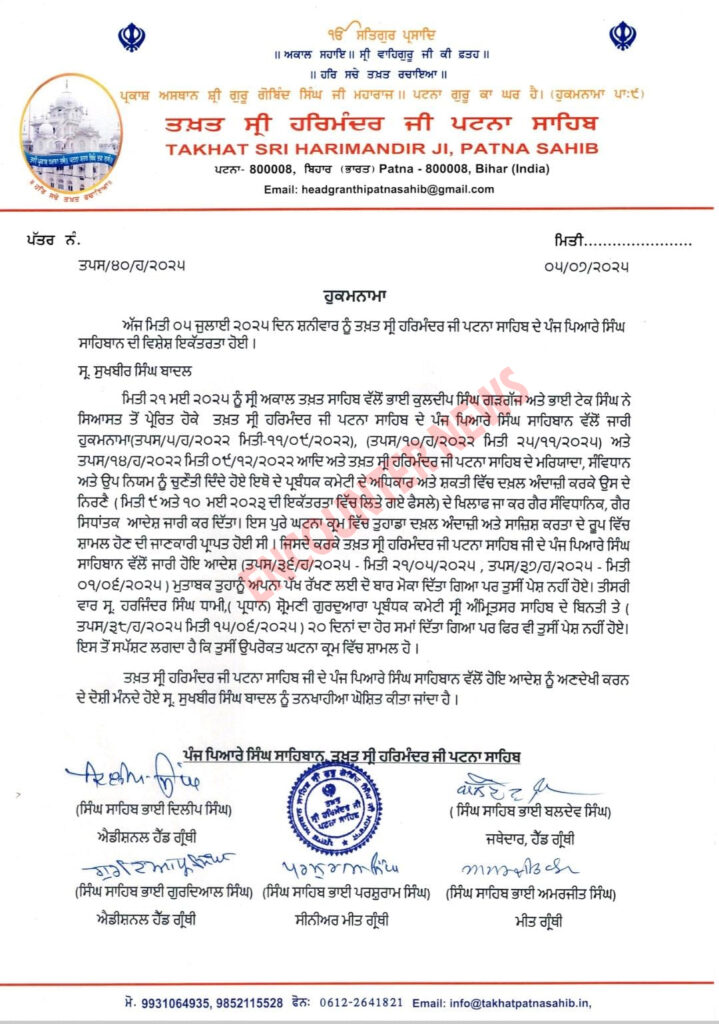 पटनाः तख्त श्री पटना साहिब में पंज प्यारों ने अकाली दल के अध्यक्ष सुखबीर सिंह बादल को तनखैया करार दिया है। दरअसल, सुखबीर सिंह बादल पंज प्यारों के सामने पेश नहीं हुए। उनकी पेशी को लेकर शिरोमणि कमेटी अध्यक्ष हरजिंदर सिंह धामी ने पंज प्यारों से कुछ समय मांगा था। अब आज सुबह पंज प्यारे ने सुखबीर सिंह बादल को तनखैया घोषित कर दिया है।