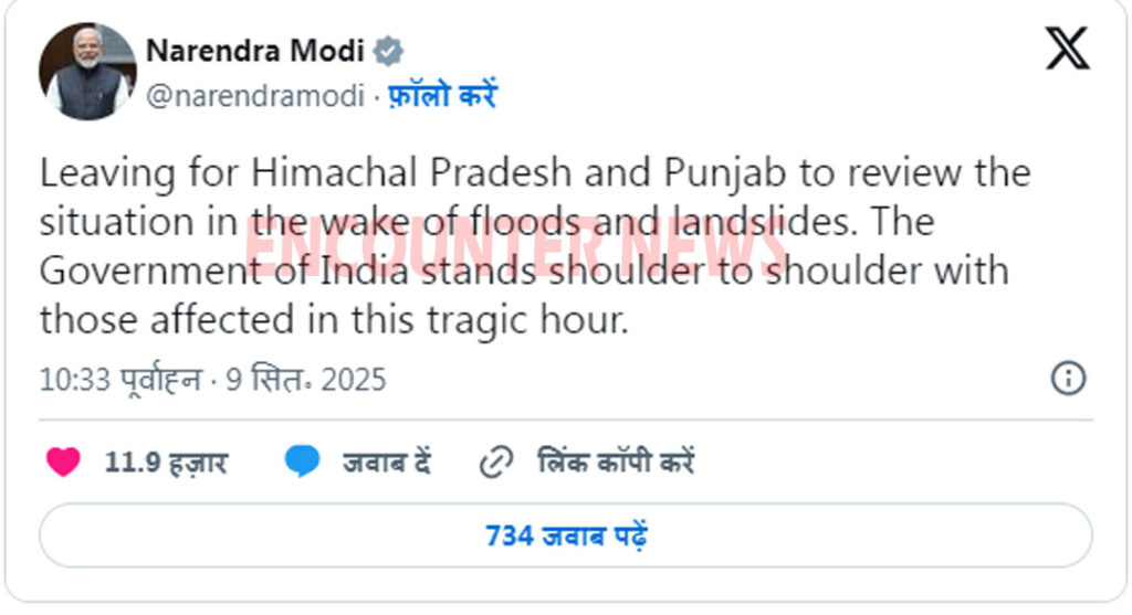 दौरे से पहले प्रधानमंत्री मोदी ने ट्वीट किया और लिखा कि “बाढ़ और भूस्खलन के बाद की स्थिति का जायजा लेने के लिए हिमाचल प्रदेश और पंजाब के लिए रवाना हो रहा हूं। भारत सरकार इस दुखद घड़ी में प्रभावित लोगों के साथ कंधे से कंधा मिलाकर खड़ी है।” दोनों राज्यों में सेना, एनडीआरएफ और स्थानीय प्रशासन लगातार राहत और बचाव कार्यों में लगे हुए हैं। हजारों लोगों को सुरक्षित स्थानों पर पहुंचाया गया है। प्रभावित इलाकों में भोजन, पानी और दवाइयों की सप्लाई की जा रही है। साथ ही, कई जगहों पर अस्थायी राहत शिविर बनाए गए हैं, जहां पीड़ित परिवार शरण लिए हुए हैं।