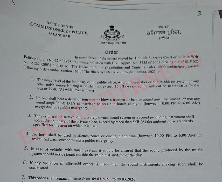 इसी तरह प्राइवेट मालिकाना वाले साउंड सिस्टम या आवाज पैदा करने वाले उपकरण का शोर का स्तर प्राइवेट जगह के हद क्षेत्र के लिए तय शोर मापदंड 5 डीबी(A) से अधिक नहीं होगा। आदेशों में यह भी कहा गया है कि म्यूजिक सिस्टम वाले वाहनों के मामले में यह सुनिश्चित किया जाना चाहिए कि म्यूजिक सिस्टम के जरिए पैदा होने वाली आवाज कई समय वाहन से बाहर न सुनाई दे। यदि इन आदेशों का उल्लंघन पाया जाता है तो ऐसा करने वाले साउंड उपकरण को जब्त कर लिया जाएगा। ये आदेश तारीख 8.3.2026 तक लागू रहेंगे।