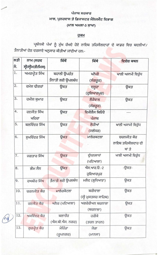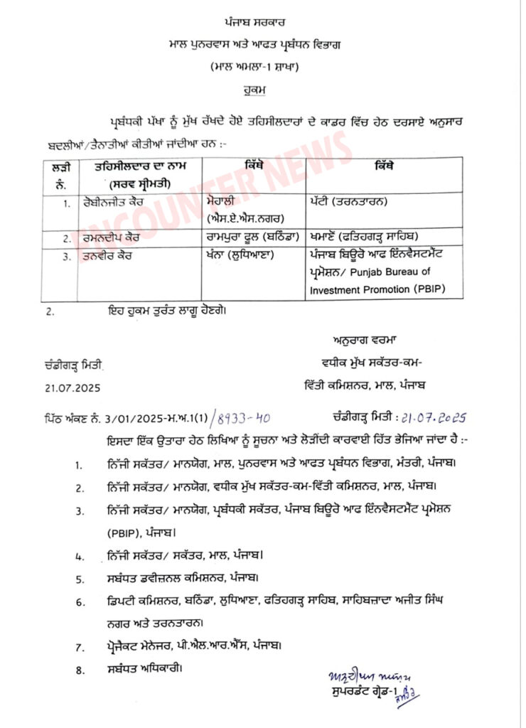 मोहालीः पंजाब सरकार द्वारा लगातार अधिकारियों के तबादलें किए जा रहे है। वहीं आज सरकार की ओर से जारी सूचि के अनुसार 19 तहसीलदारों और नायब तहसीलदारों के तबादलें किए गए। जिसमें 3 तहसलीदार और 16 नायाब तहसीलदार शामिल है। देखें लिस्ट