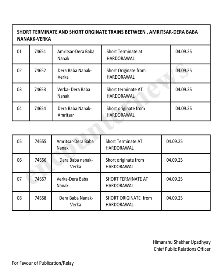 01 74651 अमृतसर-डेरा बाबा नानक हार्डोरावल पर शॉर्ट टर्मिनेट 04.09.25