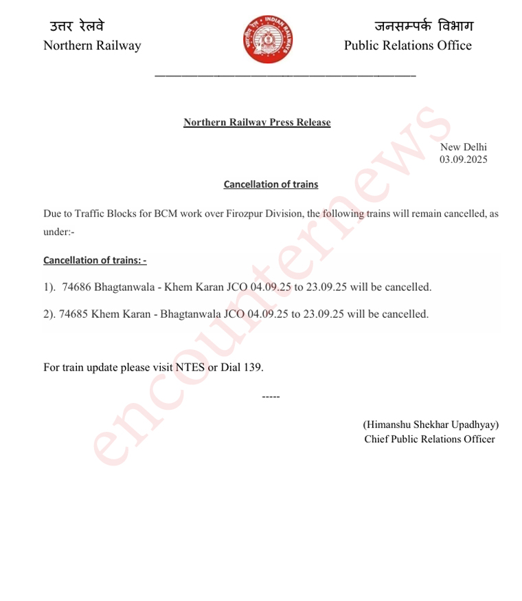 इसी के साथ 74939 जालंधर-फिरोजपुर को रद्द, 74932 फिरोजपुर-जालंधर 05 सितम्बर तक रद्द, 74931 जालंधर-फिरोजपुर आज के लिए रद्द, 74934 फिरोज़पुर-जालंधर भी आज के लिए रद्द, 74935 जालंधर-फ़िरोज़पुर रद्द, 74933 जालंधर-फ़िरोज़पुर शॉर्ट रूट मक्खू से शुरू, 54644 फिरोज़पुर-जालंधर शॉर्ट रूट मक्खू पर समाप्त, 74936 फिरोज़पुर-जालंधर रद्द, 74938 फिरोजपुर-जालंधर मक्खू पर लघु समाप्ति, 54643 जालंधर-फ़िरोज़पुर लघु मक्खू से प्रारंभ, 74937 जालंधर-फ़िरोज़पुर रद्द, 74940 फिरोजपुर-जालंधर रद्द, 13308 फिरोजपुर-धनबाद वाया फिरोजपुर-मोगा-लुधियाना डायवर्ट, 13307 धनबाद-फिरोजपुर वाया लुधियाना-मोगा-फिरोजपुर 02.09.2025 को डायवर्ट, 54637 होशियारपुर-जालंधर रद्द किया गया है।