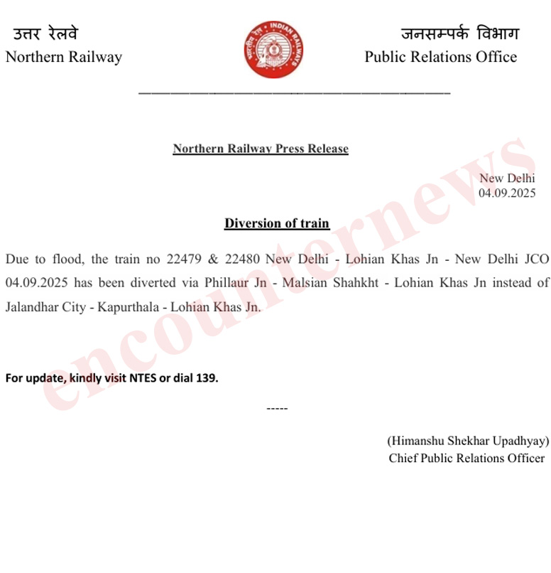 वहीं दूसरी और बाढ़ के कारण भी कई ट्रेने रद्द की गई हैं और कई ट्रेनों के रूट डायवर्ट किए गए हैं। इनमें ट्रेन नंबर 22479 और 22480 नई दिल्ली – लोहियां खास जंक्शन – नई दिल्ली जेसीओ 04.09.2025 को जालंधर सिटी – कपूरथला – लोहियां खास जंक्शन के बजाय फिल्लौर जंक्शन – मलसियां शाहखत – लोहियां खास जंक्शन के रास्ते डायवर्ट किया गया है।
