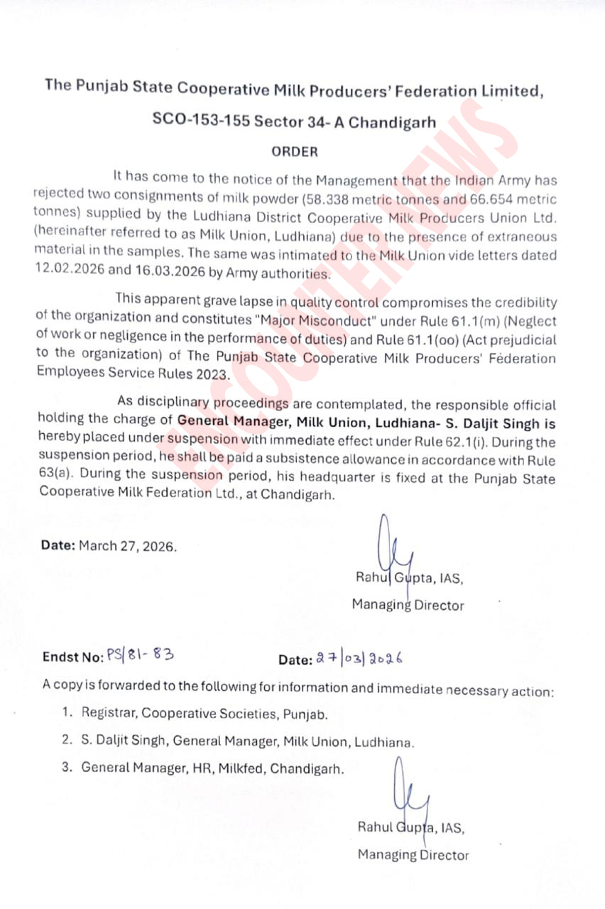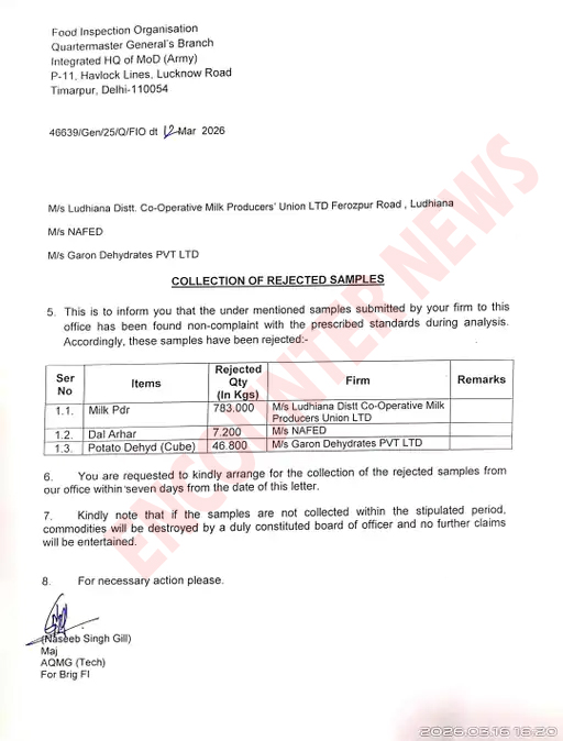 पत्र में बताया कि मिल्क पाउडर के दो बैच – एक 58.338 टन का और दूसरा 66.654 टन का रिजेक्ट कर दिए गए। रद्द करने के पीछे कारण क्वालिटी से जुड़ा होना बताया गया है। इस पत्र की कॉपी केंद्रीय रक्षा मंत्रालय में परचेज और फूड इंस्पेक्शन ऑर्गनाइजेशन के चीफ डायरेक्टर को भी भेजी गई है।