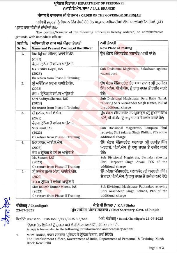 मोहालीः पंजाब में अधिकारियों के तबादलों का दौर लगातार जारी है। वहीं आज जारी हुए आदेशों के मुताबिक 5 आईएएस अधिकारियों के तबादलें किए गए। जिसमें आईएएस आदित्य शर्मा, कृतिका गोयल, सुनील, सोनम और राकेश कुमार मीना शामिल है। देखें लिस्ट