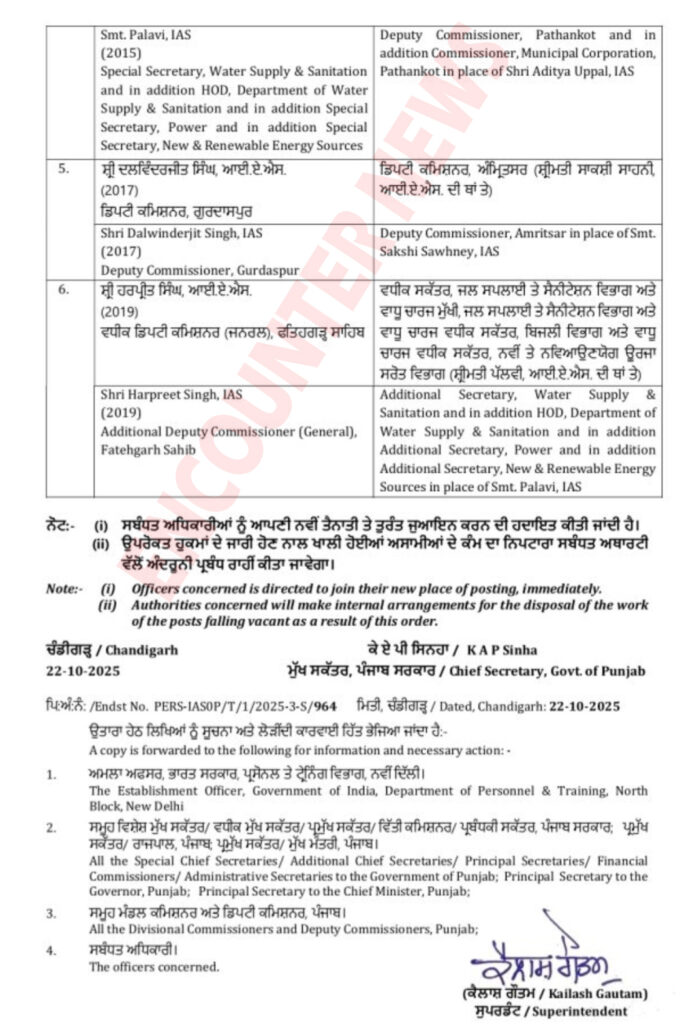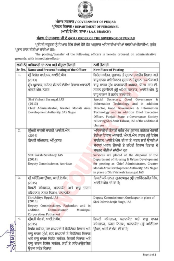 वहीं 3 जिलों के DC का तबादला किया गया है। जिसमें अमृतसर की डीसी साक्षी साहनी को अब ग्रेटर मोहाली एरिया डेवलपमेंट अथॉरिटी (गमाडा) का चीफ एडमिनिस्ट्रेटर लगाया गया है। जबकि दलविंदरजीत को अमृतसर का डीसी लगाया है। वहीं पठानकोट और गुरदासपुर के डीसी को भी बदला गया है। जिसमें आदित्य उप्पल को गुरदासपुर और पल्लवी को पठानकोट में तैनात किया गया है।