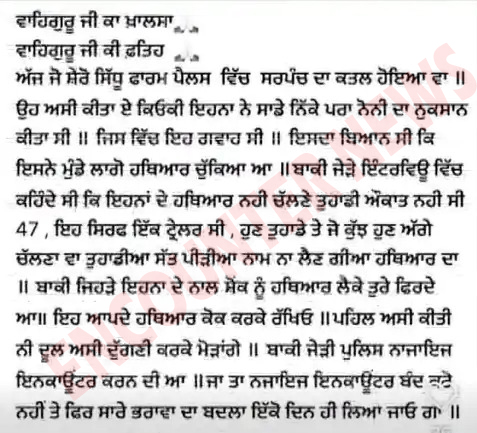 जिसको लेकर उसने पोस्ट भी वायरल की है। वायरल पोस्ट में लंडा ने लिखा है कि आज जो सिद्धू फार्म पैलिस पर सरपंच का कत्ल हुआ है, वह हमने किया है, क्योंकि इन्होंने हमारे छोटे भाई नौनी का नुकसान किया था, जिसमें ये गवाह था। यह सिर्फ ट्रेलर था, अब तुम पर आगे जो भी होगा, तुम्हारी 7 पीड़ियां हथियारों का नाम नहीं लेंगी। पुलिस न जायज एनकाउंटर कर रही, या तो इनको बंद करो, नहीं तो सरे भाइयों का बदला एक ही दिन लिया जाएगा।